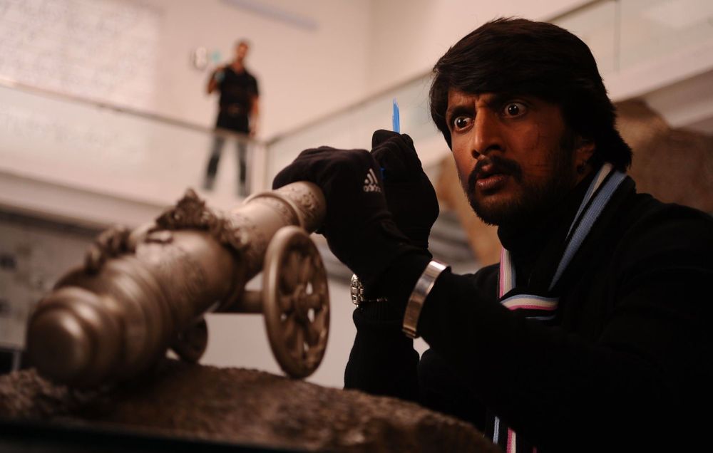 Next morning, Sudeep finds out that Bindu and Nani are working together to kill him. Enraged, Sudeep brings Bindu to his house and starts abusing her. He also clips Nani's wings and stabs it fatally. A dying Nani then sacrifices its life by jumping through a lighted matchstick, inflaming itself and entering a loaded cannon, which fires up and kills Sudeep.